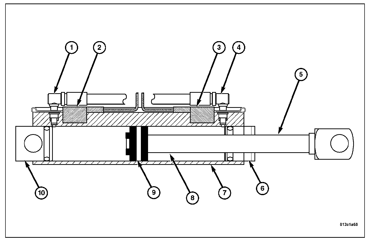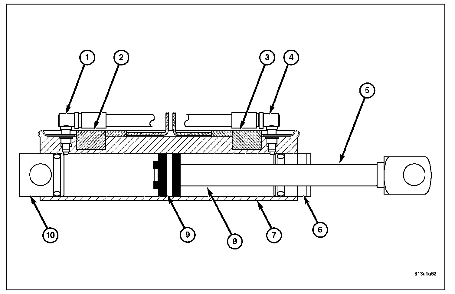 The Main Bow Hydraulic Cylinders are used to control the movement of the main bow of the Convertible Top. The cylinders are pressurized with oil from the hydraulic pump assembly through the hydraulic lines (1) and (4). The Main Bow Cylinders have travel sensors (2) and (3) mounted on both the rod side (6) and the base side (10) of the cylinder.