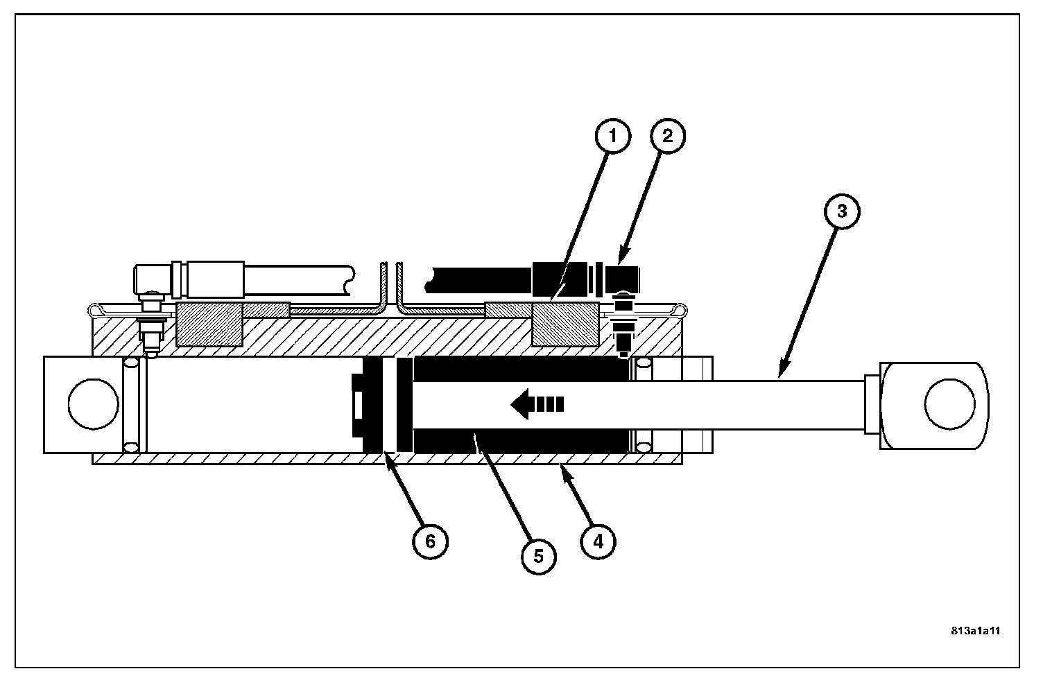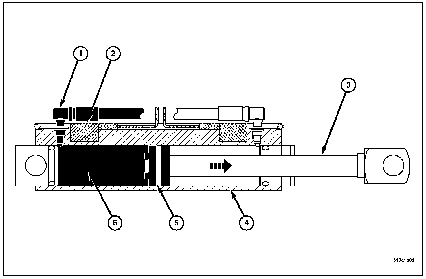 The Tonneau Cover Hydraulic Cylinder is used to control the movement of the Tonneau Cover. The cylinder is pressurized with oil from the hydraulic pump assembly through the hydraulic lines (1) and (4). The Tonneau Cover Cylinder has only one travel sensor mounted on the rod side (6) of the cylinder.