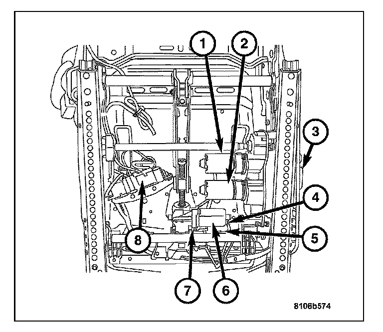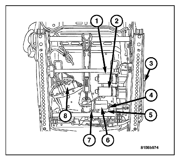 3. Remove the power seat track rear inboard and outboard attachment bolts (1).