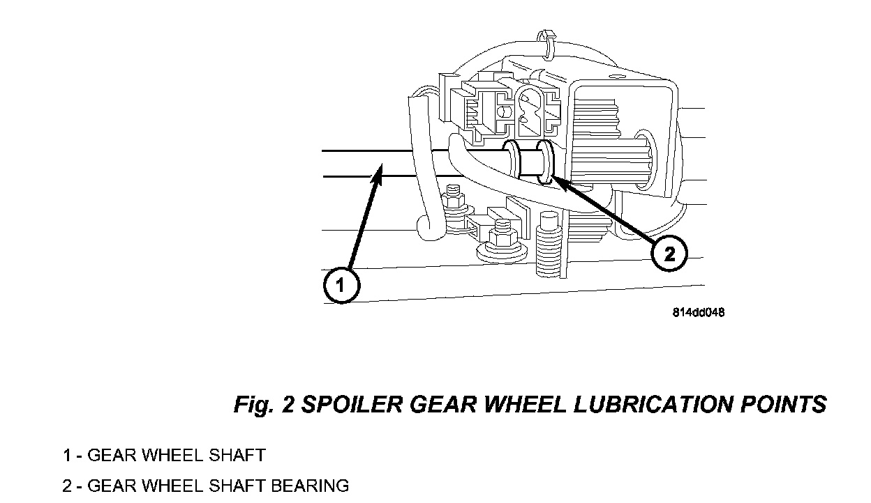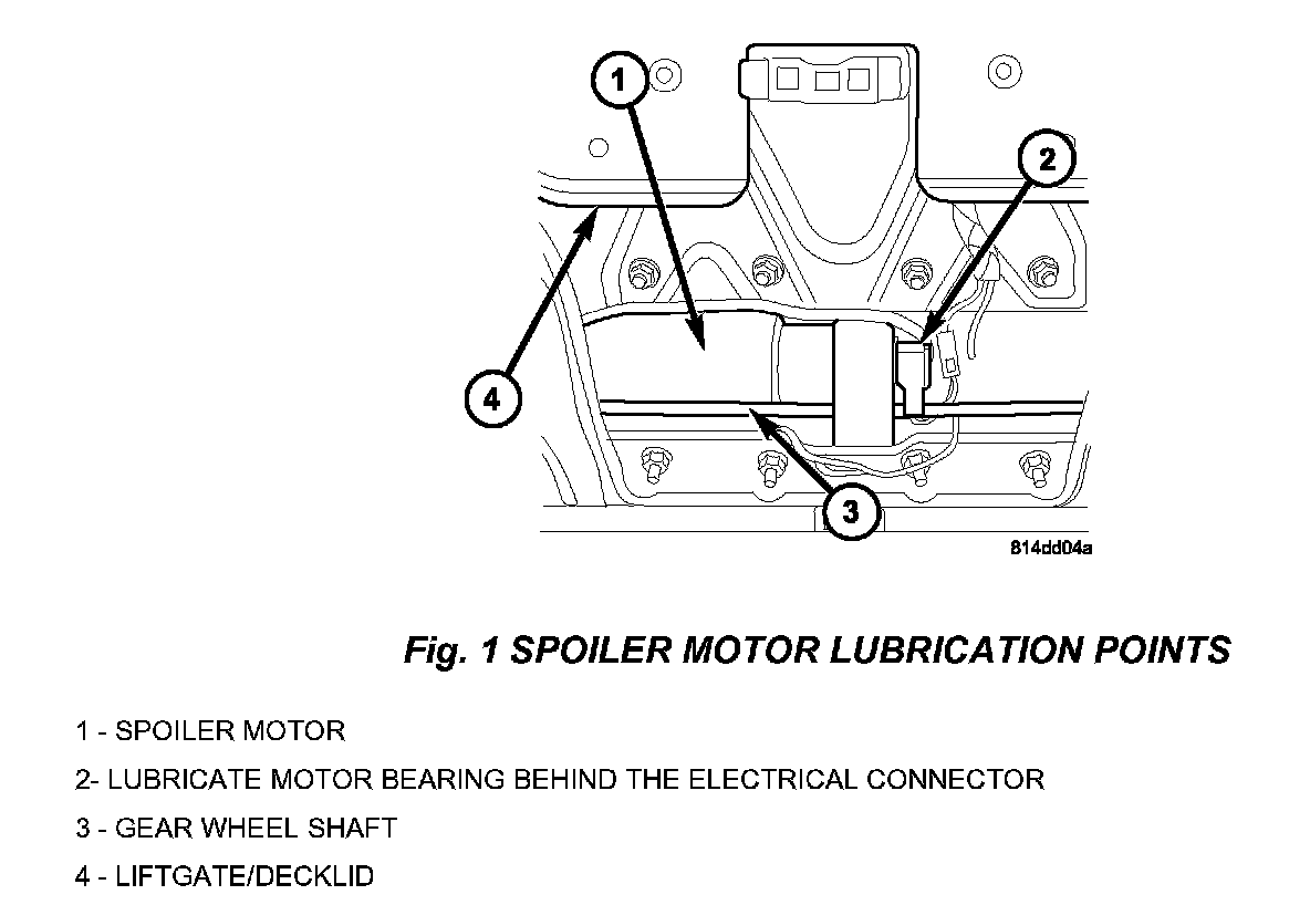 2. Once the spoiler motor is exposed, using krytox lubricant, p/n 05019059AA, lubricate the points referenced (Fig. 1) and (Fig. 2).