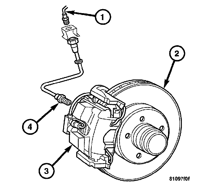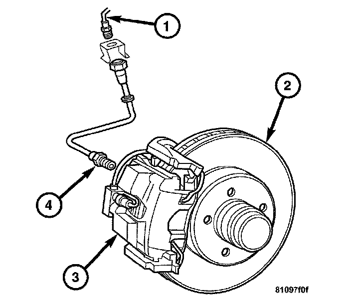 1. Install the inboard and outboard brake pads (2 and 3) onto the caliper (1).