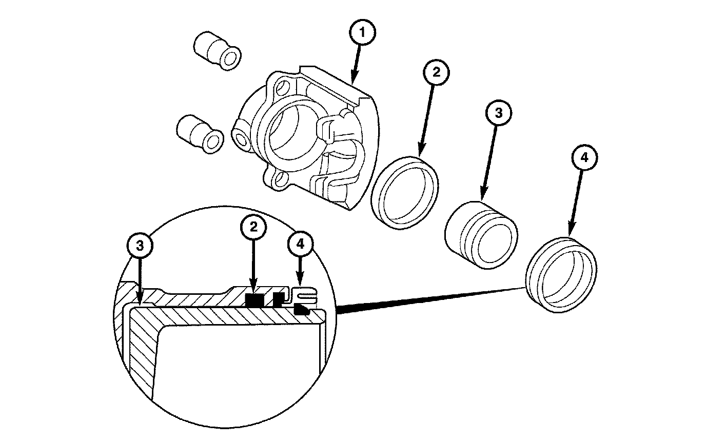 5. Install the piston (3) into the caliper bore and press the piston down to the bottom of the caliper bore by hand or with the handle of a hammer.