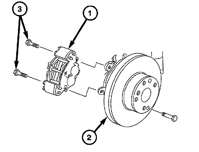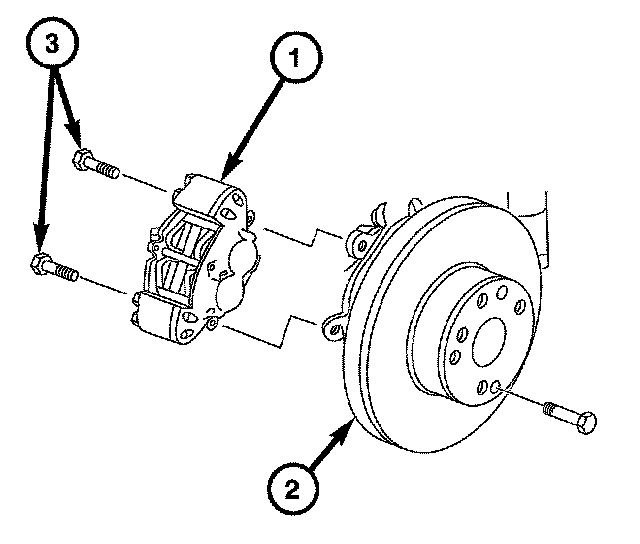 4. Remove the caliper bracket mounting bolts (3) and remove the caliper (1) and bracket as an assembly from the steering knuckle (2).