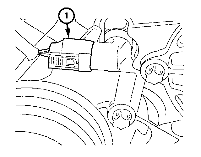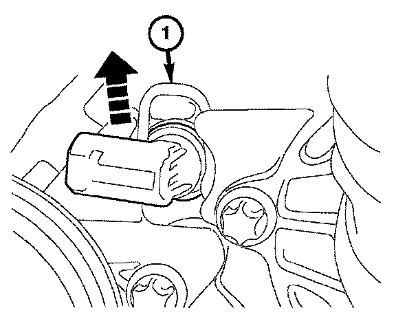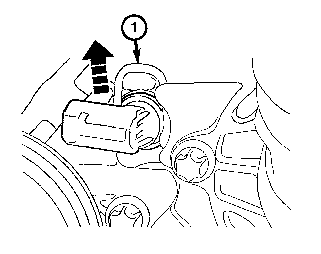 12. Pull up on the engine coolant temperature sensor retaining clip (1) and slide the engine coolant temperature sensor out of the housing.