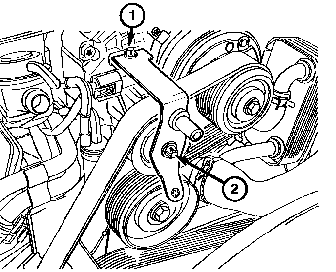 6. Install the supercharger idler pulley upper mounting bolt (1) and the lower mounting bolt (2). Tighten the mounting bolts to 20 Nm (15 ft. lbs.).