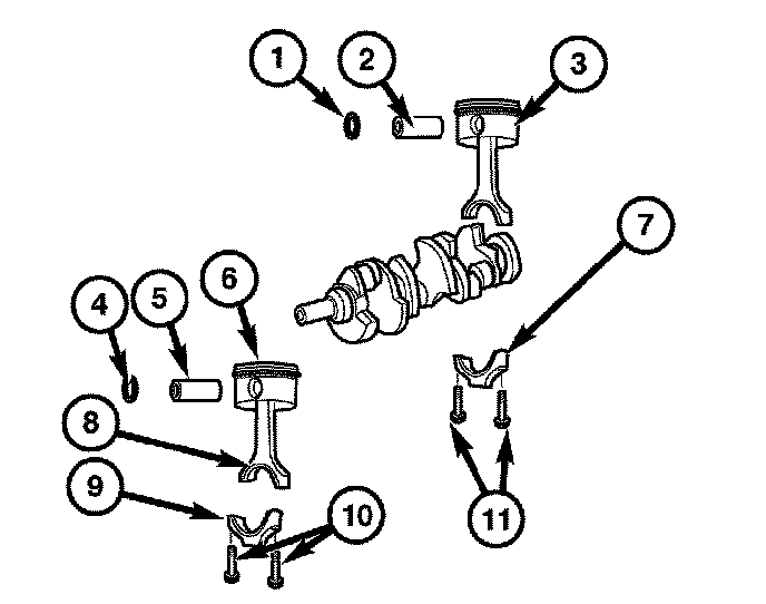 Flat-topped aluminum pistons (3 and 6) have machined pockets for valve clearance and asymmetrical skirts for low-temperature noise control. The pistons are formed from a special aluminum alloy to cope with the high temperatures created by dual ignition. In addition, the upper portions are hard anodized to protect the top ring. For optimal wear protection, the piston skirts receive an iron coating. Three, low-tension piston rings provide compression control with low oil consumption. Forged steel connecting rods (8) and crankshaft provide requisite strength with light weight. Connecting rods are forged in one piece from steel, and cracked rather than machined along the split line, providing a perfect fit for the two halves and reducing weight by 20 percent compared to a fully machined rod and cap while also greatly reducing machining. The rods are drilled longitudinally to deliver oil under pressure to the wrist pins (2 and 5), minimizing wear for long life.