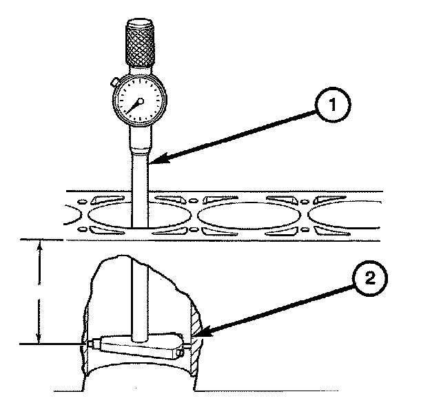 The piston and cylinder walls must be clean and dry. Piston diameter should be measured 90 degrees to piston pin axis. Cylinder bores should be measured halfway down the cylinder bore (2) and transverse to the engine crankshaft center line.