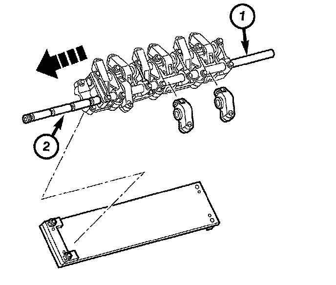 2. Use a 16 mm drift (1) to drive out the rocker shaft (2).