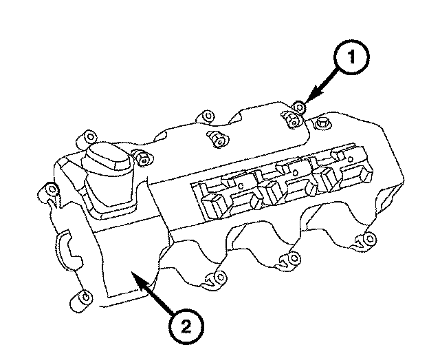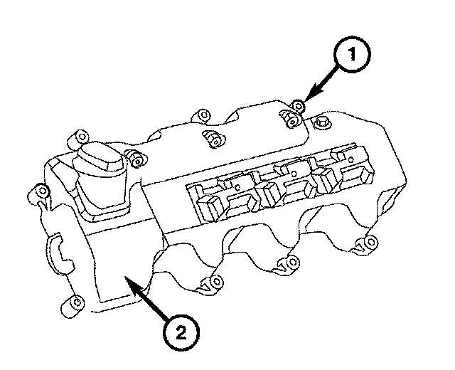 2. Position the cylinder head covers (2) on the cylinder head. Install the cylinder head cover bolts (1) and tighten to 10 Nm (7 ft. lbs.).