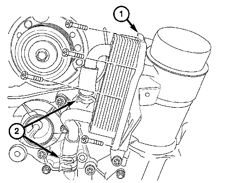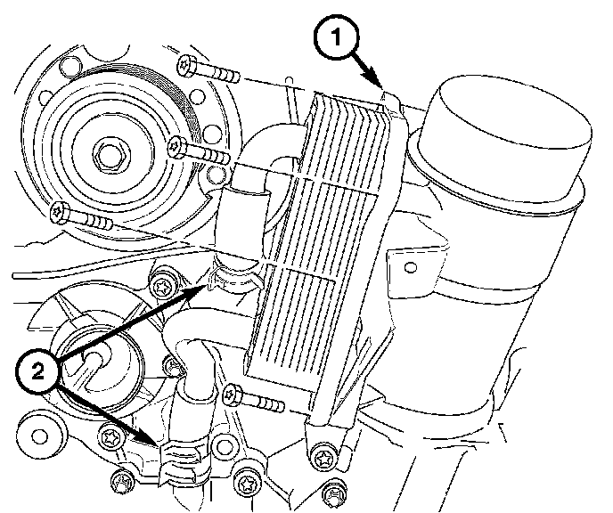 2. Install the four bolts attaching the oil cooler (1) to the engine. Tighten bolts to 11 Nm (97 inch lbs.).