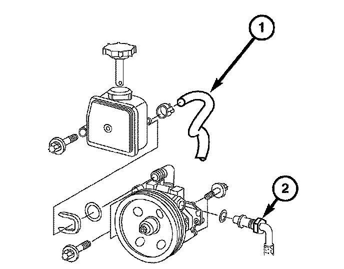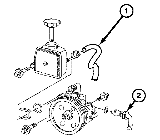 11. Disconnect the pressure (2) and return (1) lines from the power steering pump.