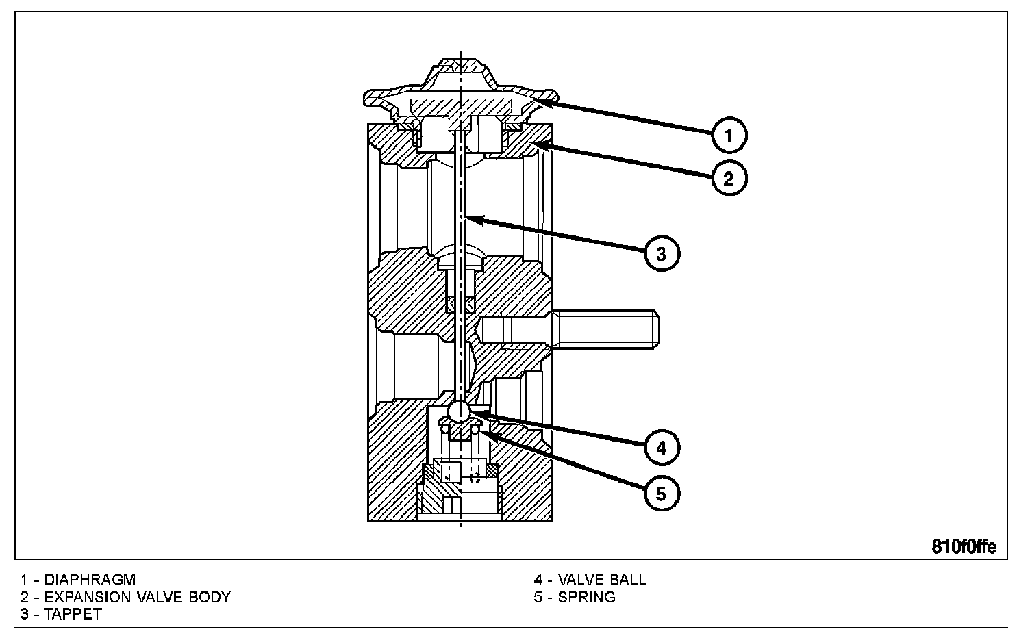 When the A/C compressor is switched on the pressure in the evaporator decreases causing the diaphragm (1) to flex downward in an arch. The tappet (3) follows the motion of the diaphragm and presses the valve ball (4) away from its seat against the force of the spring (5). The refrigerant is sprayed into the evaporator through the open valve. Since the motion of the diaphragm (1) is dependent on the intake pressure as well as the temperature at the evaporator output, only the quantity of refrigerant which can be evaporated optimally is injected.