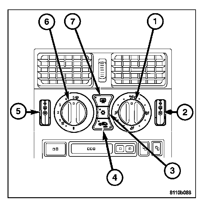 2. Set the A/C Heater mode control switch knob (2) in the Panel position, the temperature control knob (7) in the full cool position, the A/C button in the On position, and the blower motor switch knob (6) in the highest speed position.