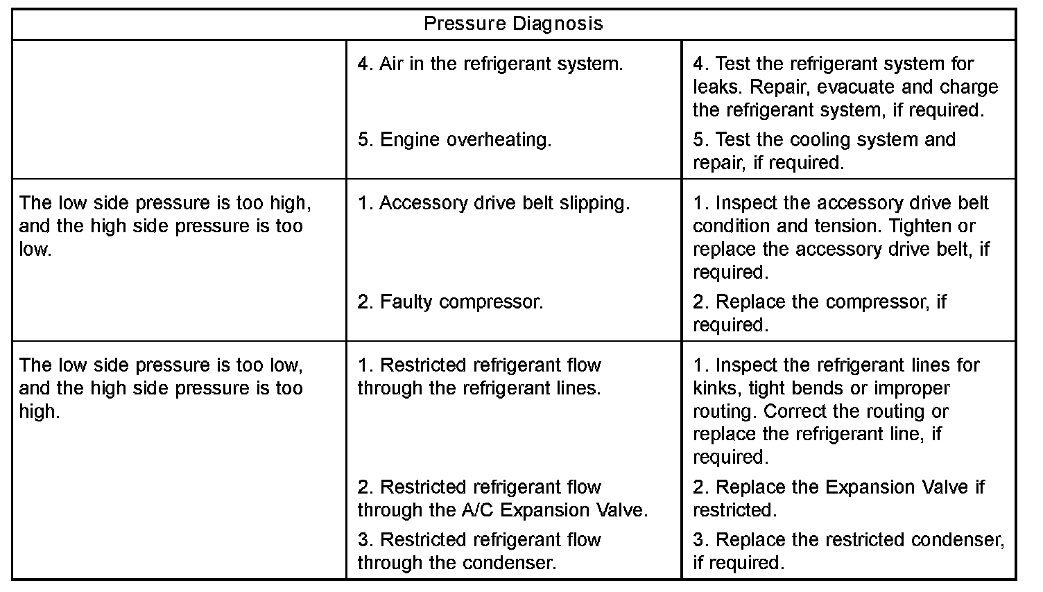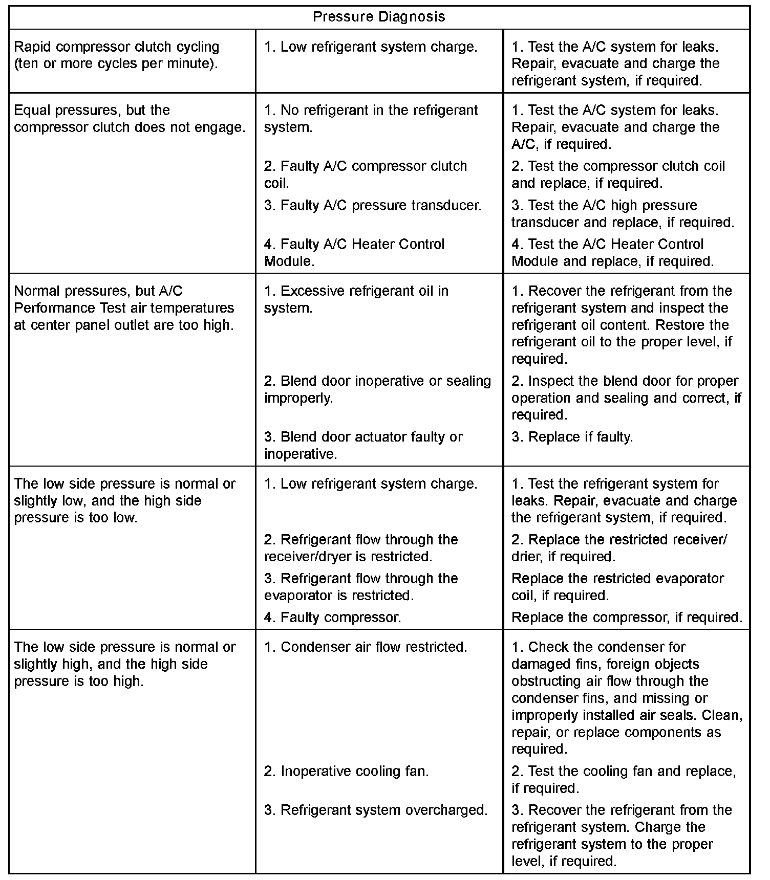 9. Compare the compressor discharge pressure to the Performance Temperature and Pressure chart. If the compressor discharge pressure is high, see the Pressure Diagnosis chart.