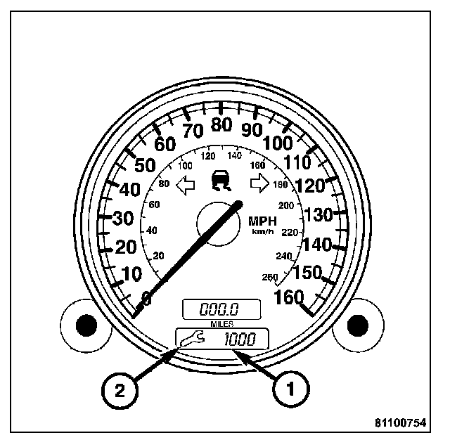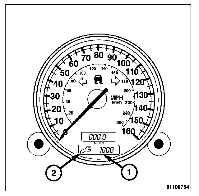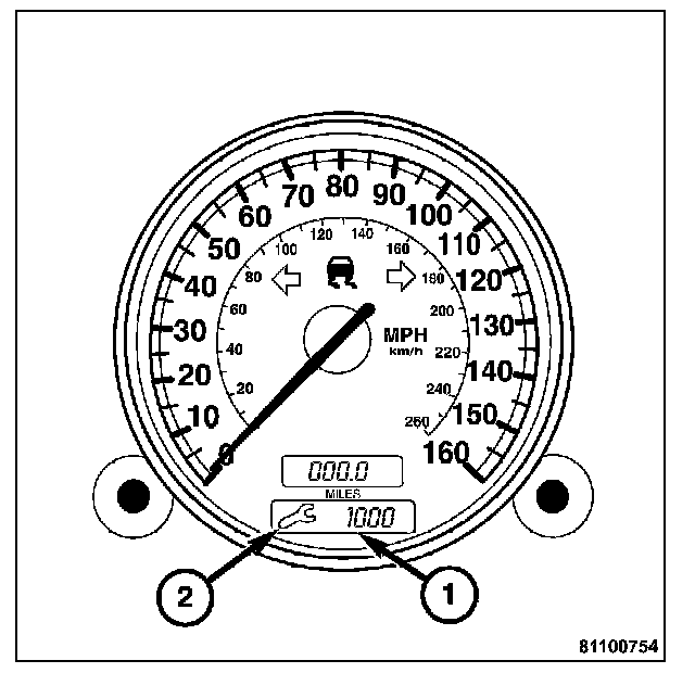 Move the ignition switch to the "RUN" position and press the left instrument cluster button twice within 1 second. The tool symbol (2) will appear and the current remaining distance appear for 10 seconds.