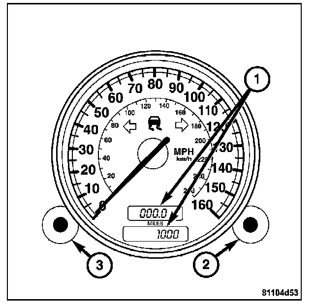 6. Continue to press and hold the reset button for the trip odometer (about 10 seconds) until the audible signal sounds and the new start distance appears (1) in the display. The tool symbol (2) should disappear at this time.
