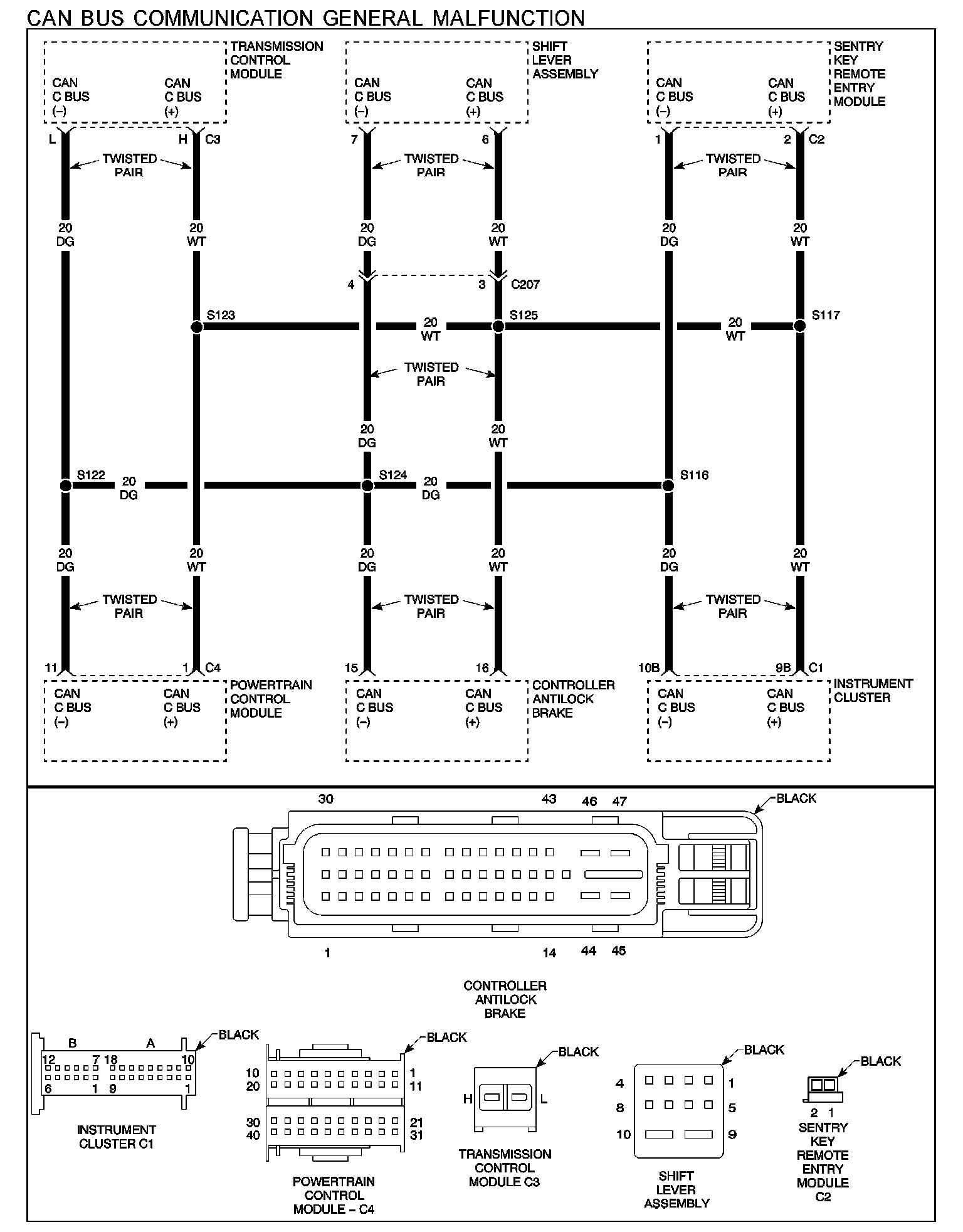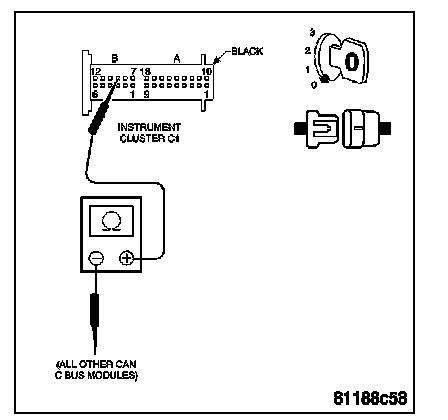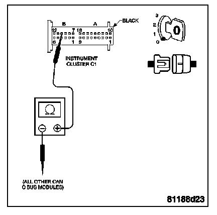 NOTE: Check connectors - Clean/repair as necessary. Measure the resistance of the CAN C Bus (+) circuit from the Instrument Cluster harness connector to the harness connectors of the other modules on the CAN Bus network.