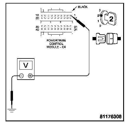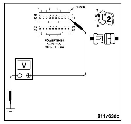 Measure the voltage of the CAN C Bus (+) circuit at the PCM C4 harness connector.