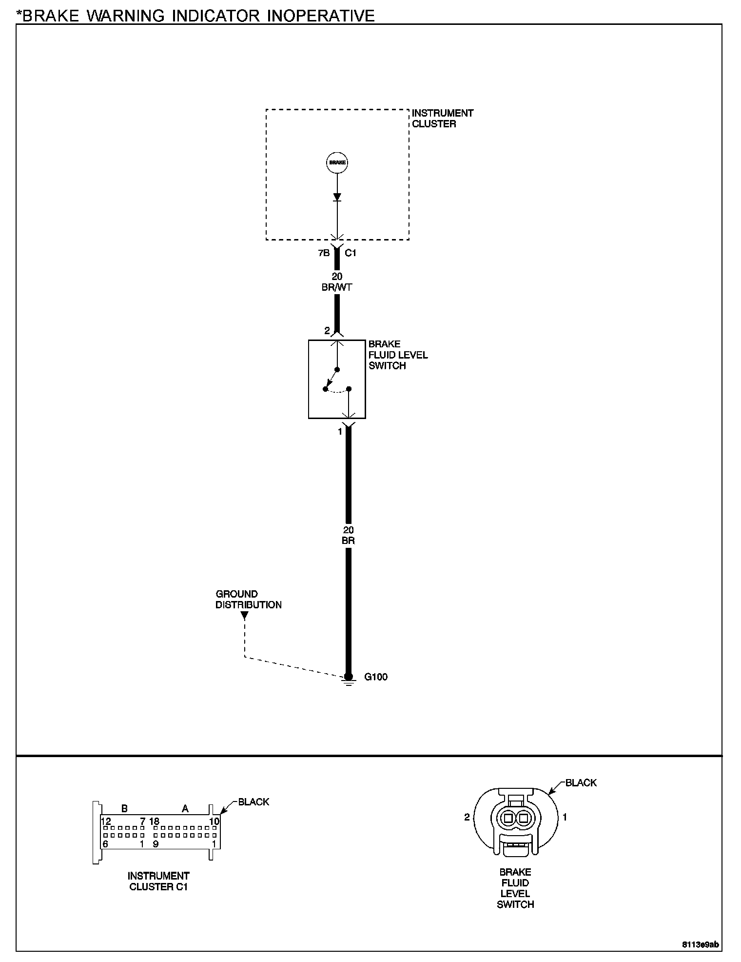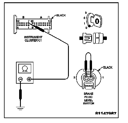Measure the resistance between ground and the Brake Warning Indicator circuit.