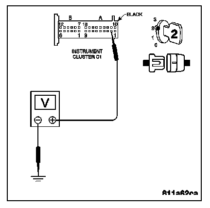 Measure the voltage of the High Beam Indicator Lamp circuit at the Instrument Cluster C1 harness connector.