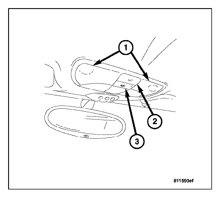 The courtesy lamps (1) provide overhead interior illumination when the doors are opened and the courtesy lamp defeat switch (3) is in the "-" position, or when the courtesy lamp switch (2) is pressed. The courtesy lamp defeat switch (3) can prevent the courtesy lamps operation when the doors are opened if the "O" position is selected. The courtesy lamp switch/unit cannot be adjusted or repaired. If faulty, worn, or damaged, the entire assembly must be replaced.