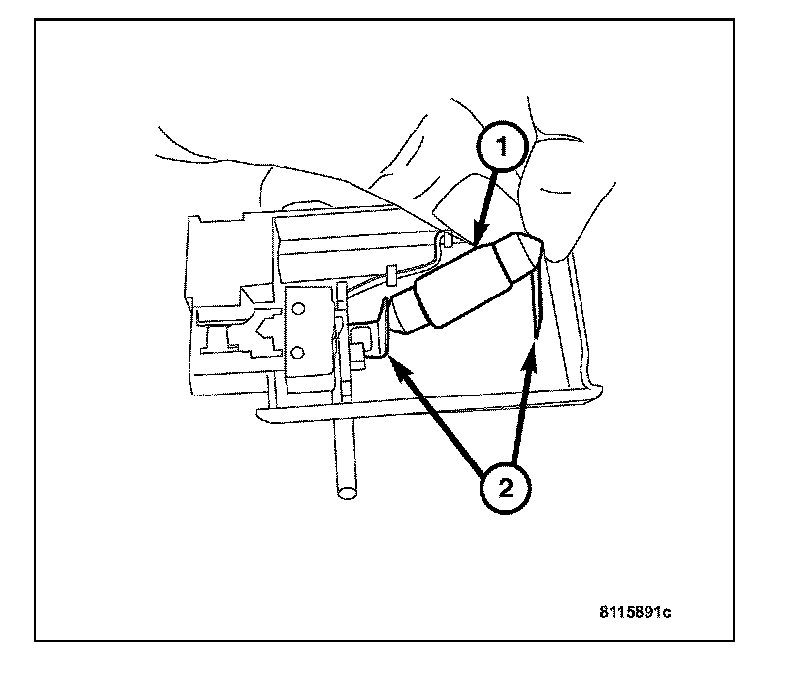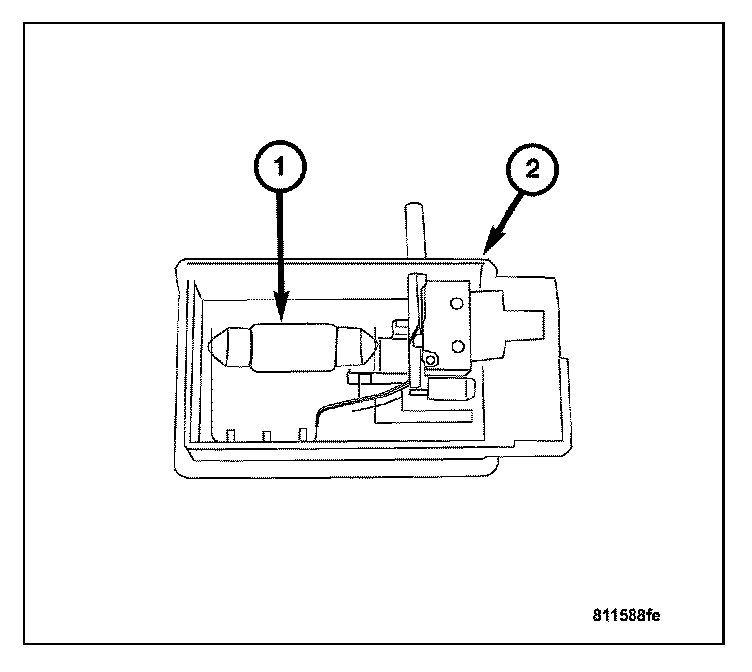 1. Press the bulb retaining arm (2) aside and install the bulb (1) into the glove box lamp/switch assembly.