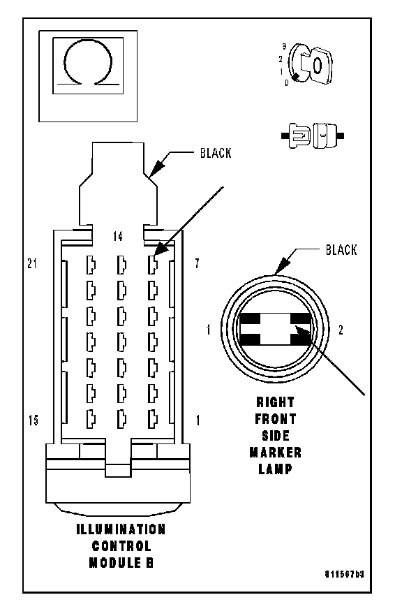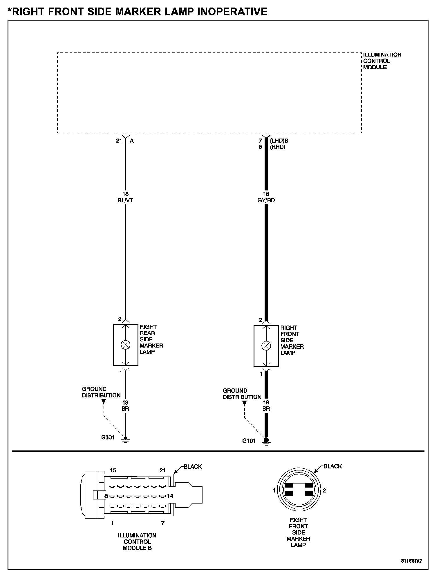NOTE: If the right front side marker lamp, the right park lamp, the right rear side marker lamp, and the right tail lamp are inoperative, inspect Fuse 7 located in the Illumination Control Module/IP Fuse Block. If the fuse is open, repair the cause of the open fuse before continuing.