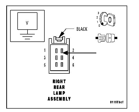 Measure the voltage between the Right Rear Lamp Assembly harness connector cavity 2 and ground.