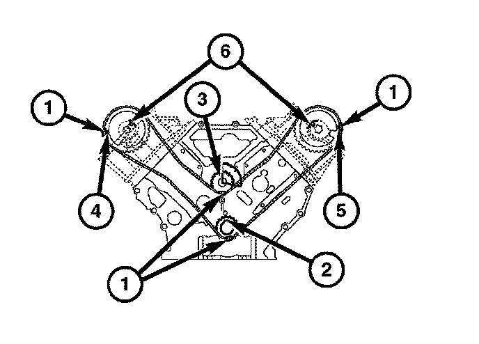 The crankshaft driven timing chain maintains camshaft (6) and balance shaft (3) operation and timing. Timing marks on the crankshaft (2) , balance shaft (3) and camshafts (5) are aligned with copper links (1) in the timing chain to keep symmetrical valve and ignition performance.