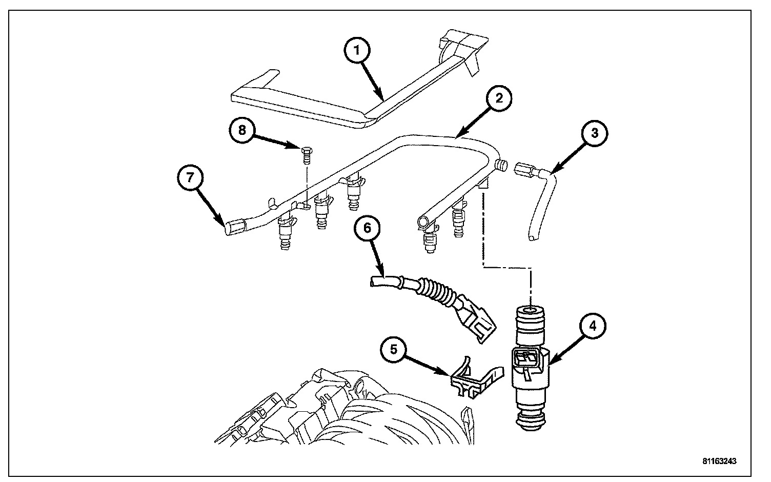 7. Remove the fuel rail (2) with the fuel injectors (4) by moving the fuel rail (2) side to side and lifting gently upward.