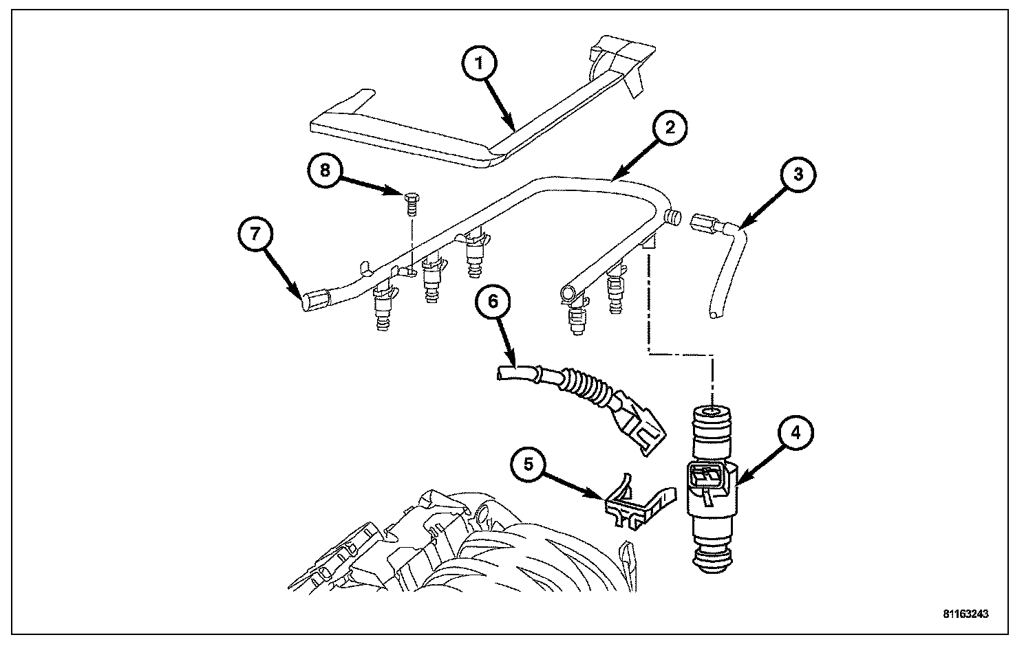 6. Remove the fuel rail bolts (8) attaching the fuel rail (2) to the intake manifold.