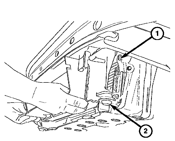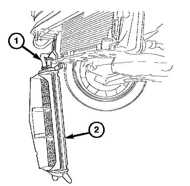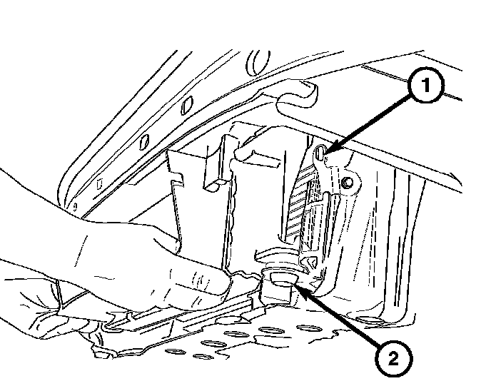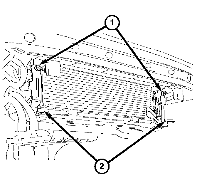 1. Locate the upper mounting studs (1), and the lower rubber mounts (2) for the charge air cooler radiator.