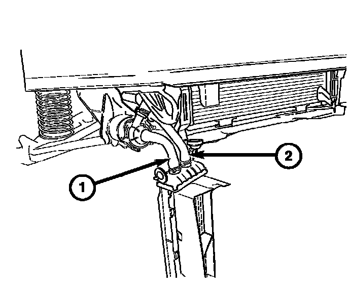 9. Disconnect the inlet coolant hose (2) and the outlet coolant hose (1) from the charge air cooler radiator.