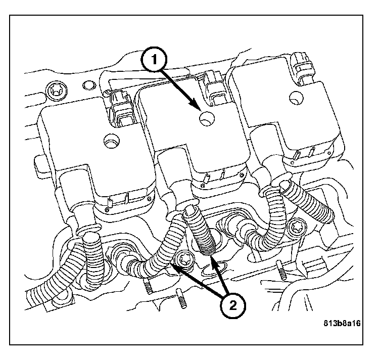 2. Install the ignition coil retaining bolt (2). Tighten the bolt to 8 N.m (71 in. lbs.).