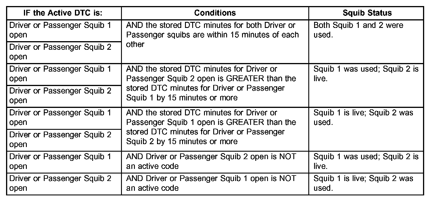 Using the active DTC information, refer to the Airbag Squib Status table to determine the status of both driver and/or passenger airbag squibs.