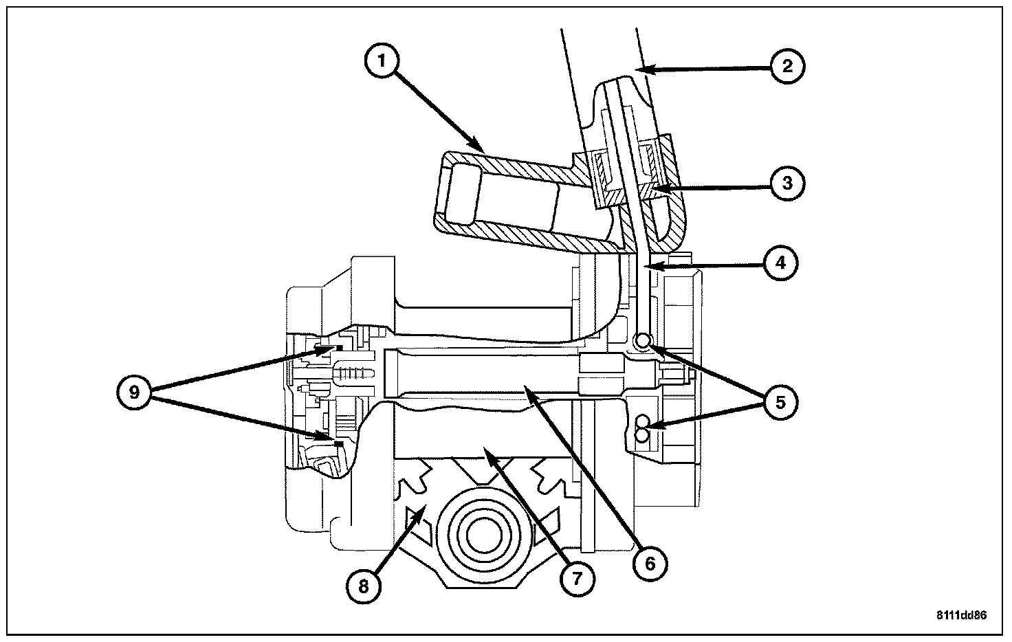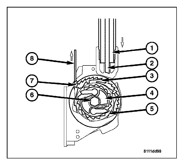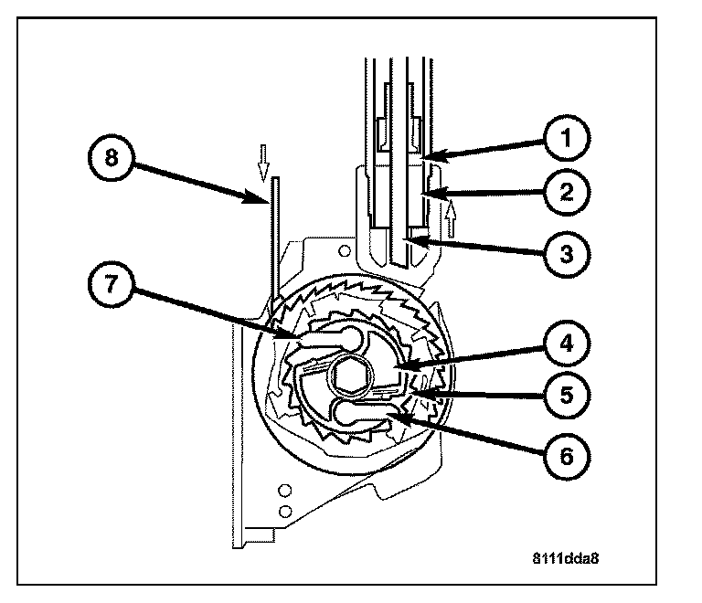 change in the direction of rotation of the retractor shaft. Inertia and centrifugal force cause the outer locking pawls (3) on the toothed ring (5) to engage in the inner teeth on the locking ring (7).