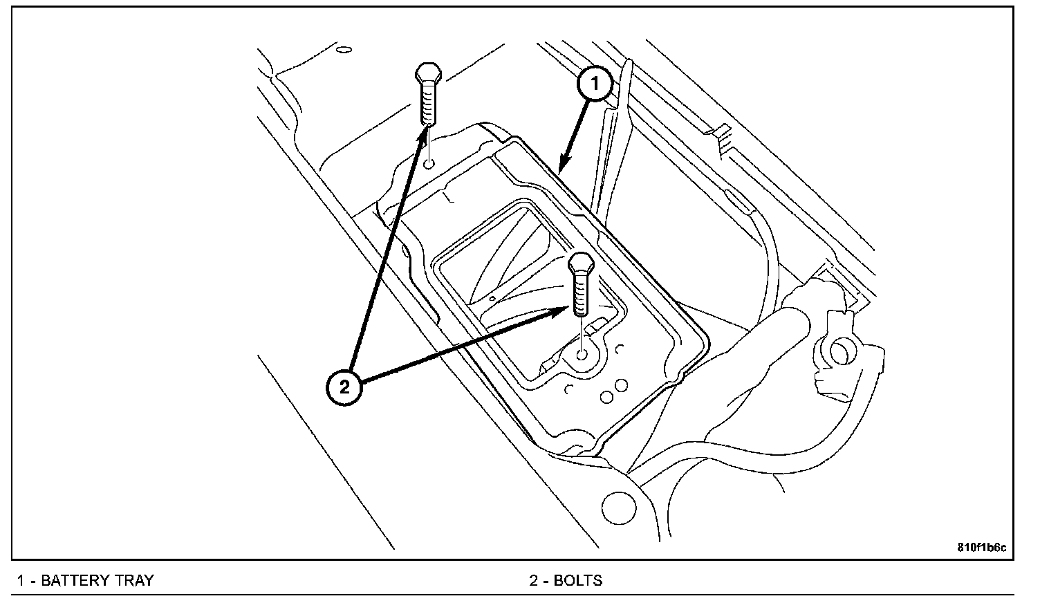 2. Install the battery tray (1) retaining bolts (2). Tighten the bolts to 15 Nm (11 ft. lbs.).
