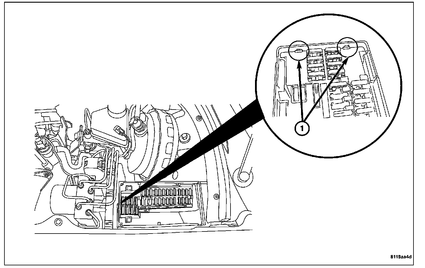 3. Push the front of the underhood accessory fuse box forward releasing the tabs (1) on the underhood fuse block.
