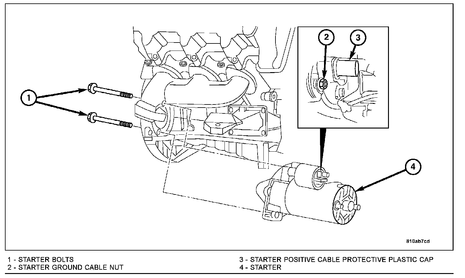 8. Disconnect the starter cables by removing the ground cable nut (2) and the positive cable nut.