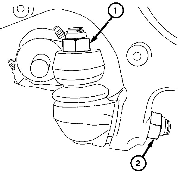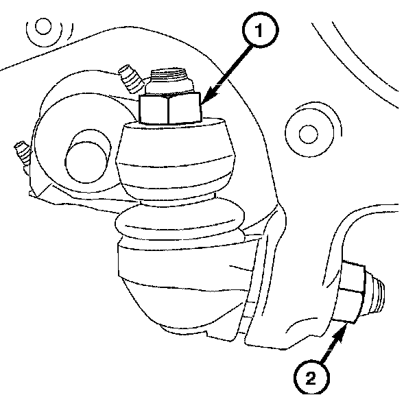 3. Install the nut (2) attaching the lower control arm to the steering knuckle lower ball joint. Tighten to 45 Nm (33 ft. lbs.).