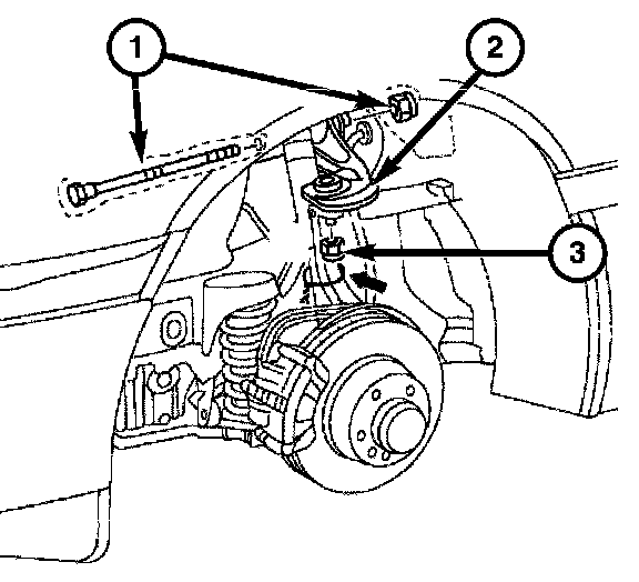 5. Remove the upper control arm (2) from the body by removing the nut and bolt (1) from the inside of the engine compartment on the shock tower.