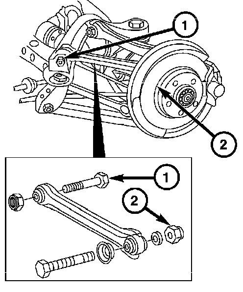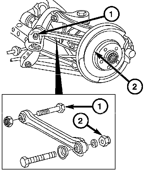 4. Remove the outer trailing link bolt (2) attaching the trailing link to the wheel carrier.
