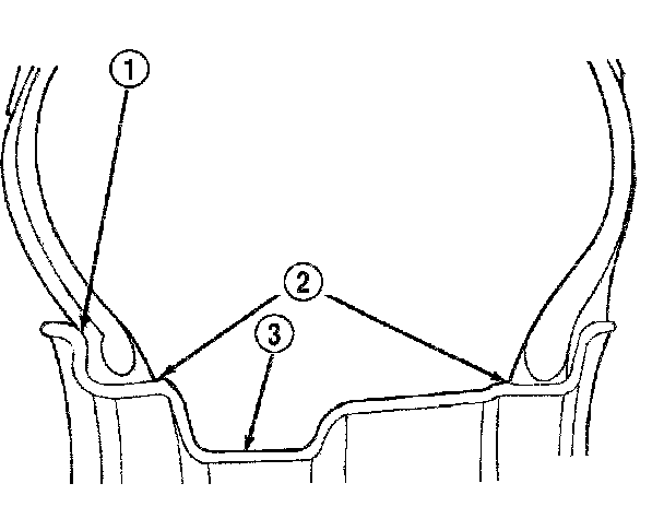 This vehicle has aluminum wheels. Every wheel has raised sections between the rim flanges (1) and rim drop well (3) called safety humps.