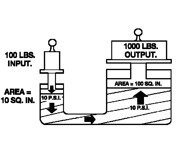 Using the 10 PSI example used in the illustration, a force of 1000 lbs. can be moved with a force of only 100 lbs. The secret of force multiplication in hydraulic systems is the total fluid contact area employed. The illustration shows an area that is ten times larger than the original area. The pressure created with the smaller 100 lb. input is 10 PSI. The concept "pressure is the same everywhere" means that the pressure underneath the larger piston is also 10 PSI. Pressure is equal to the force applied divided by the contact area. Therefore, by means of simple algebra, the output force may be found. This concept is extremely important, as it is also used in the design and operation of all shift valves and limiting valves in the valve body, as well as the pistons, of the transmission, which activate the clutches and bands. It is nothing more than using a difference of area to create a difference in pressure to move an object.