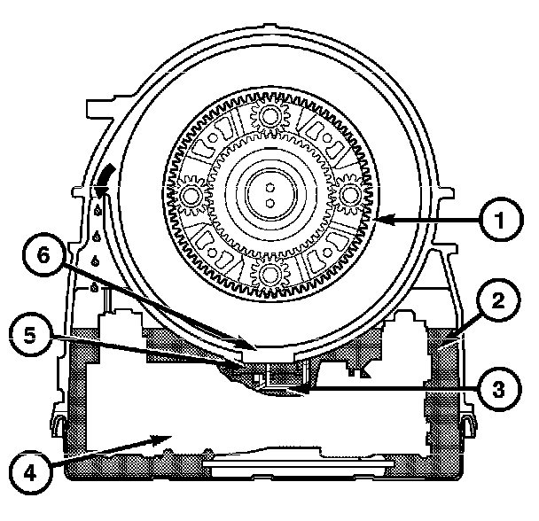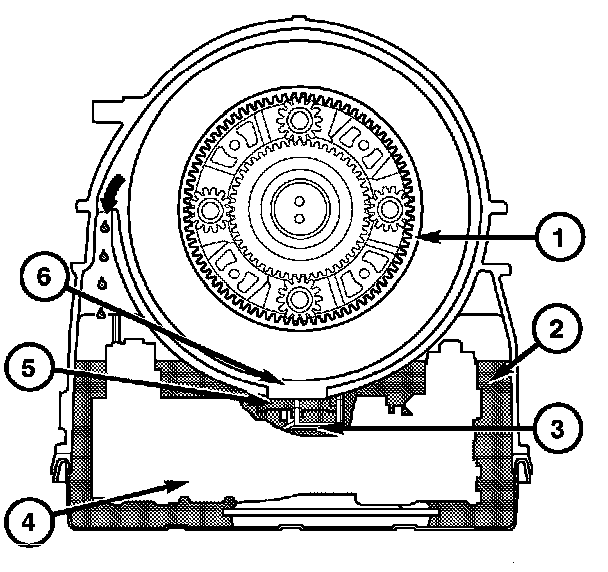 The oil level control is located on the electrohydraulic unit and consists of the float (5) which is integrated into the electrohydraulic control unit. The float is positioned to plug the opening between the oil gallery and gearset chamber so that the rotating gearsets do not splash about in oil as the oil level rises. The oil level control reduces power loss and prevents oil from being thrown out of the transmission housing at high oil temperatures.