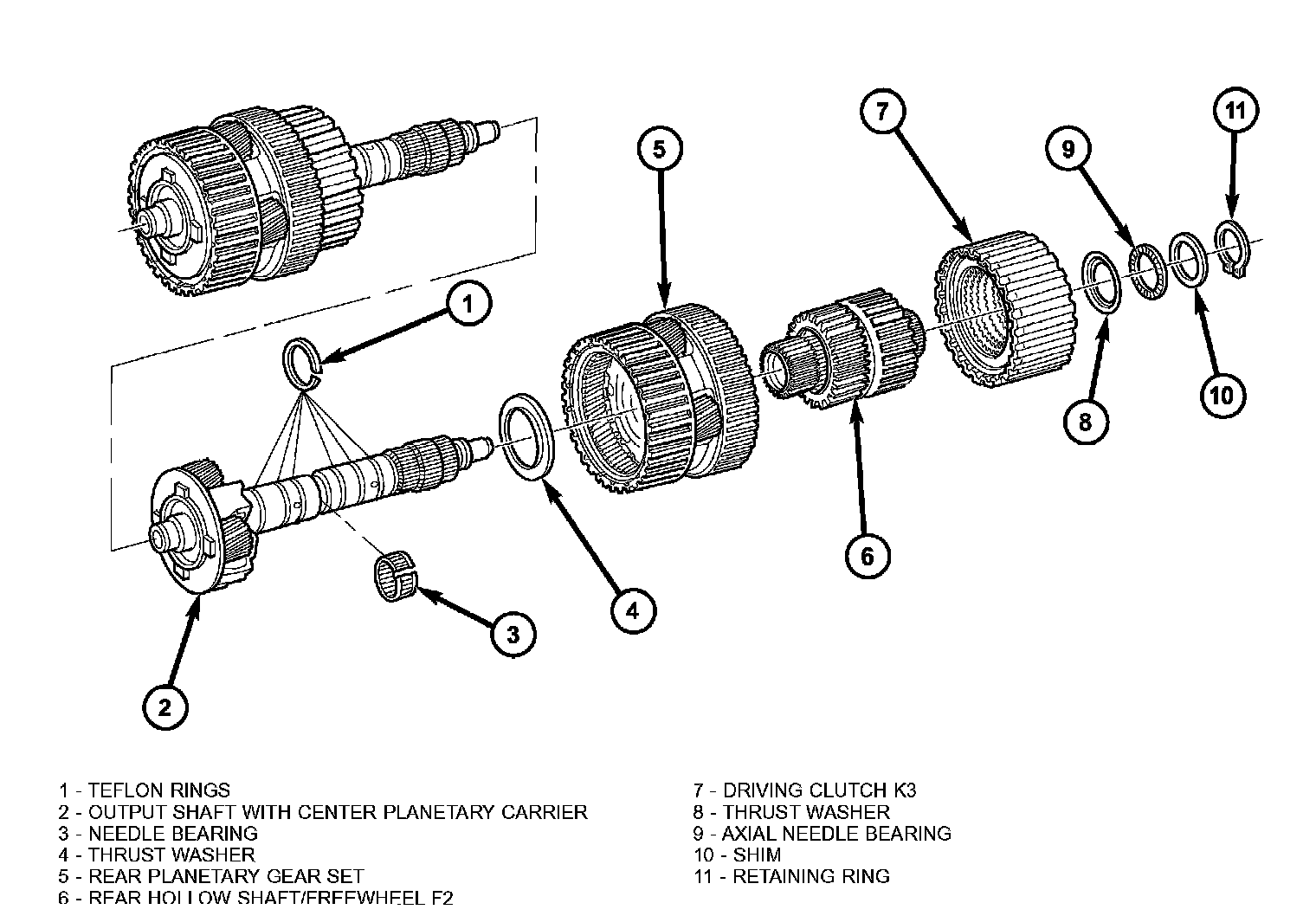 2. Mount the rear planetary gear set (5) with the integrated tubular shaft of the center gear set on the output shaft with center planetary carrier (2).