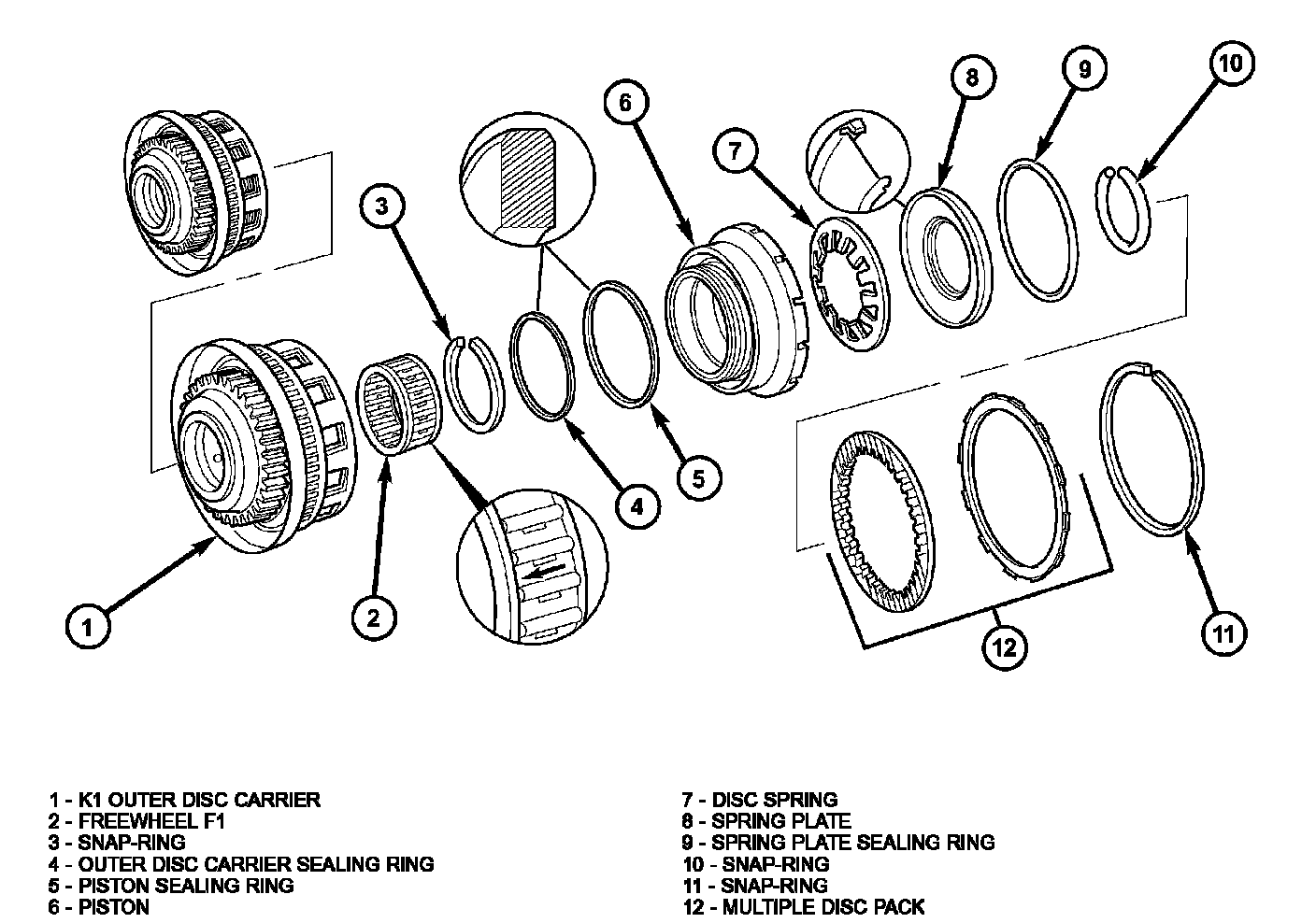 1. Remove the snap-ring (11) from the K1 outer disc carrier (1).