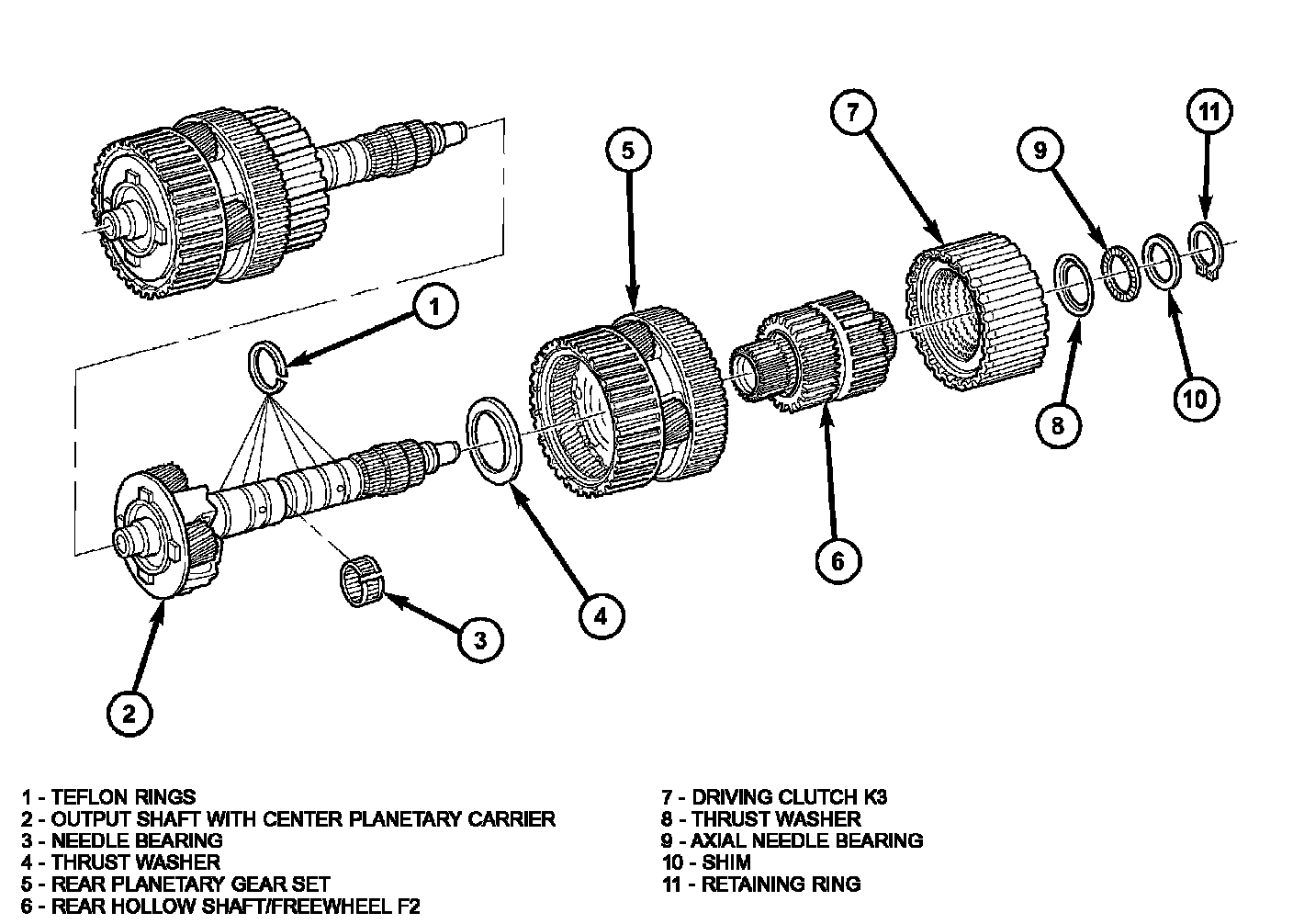 2. Remove the retaining ring (11), shim (10), axial needle bearing (9) and thrust washer (8) from the output shaft with center planetary carrier (2).
