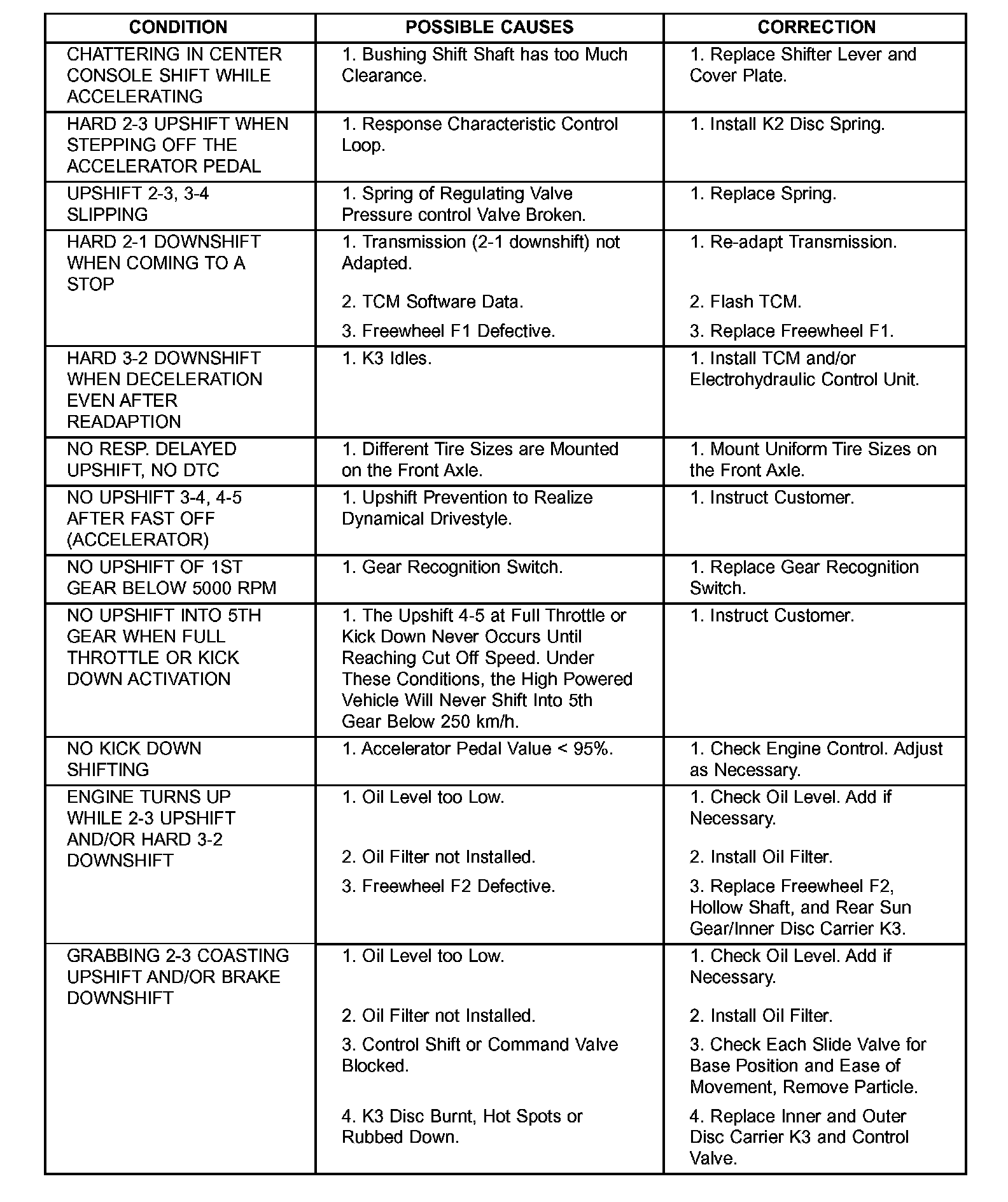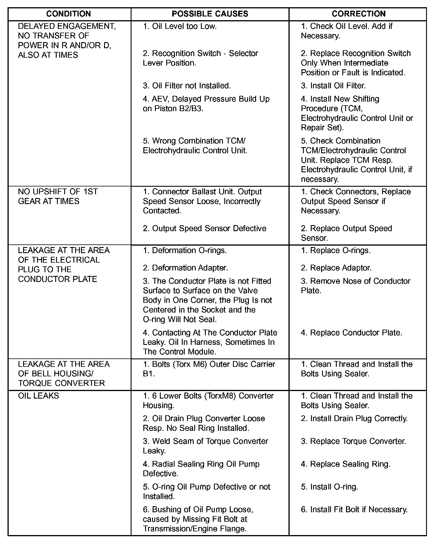 Diagnosis of these problems should always begin by checking the easily accessible variables: fluid level and condition, gearshift cable adjustment. Then perform a road test to determine if the problem has been corrected or if more diagnosis is necessary.