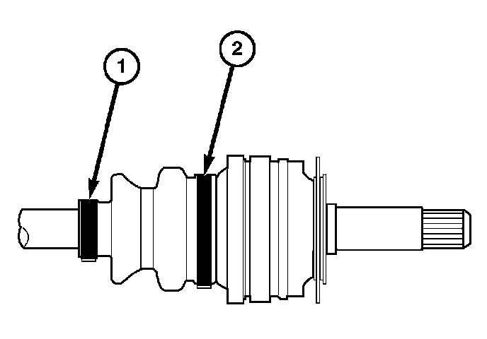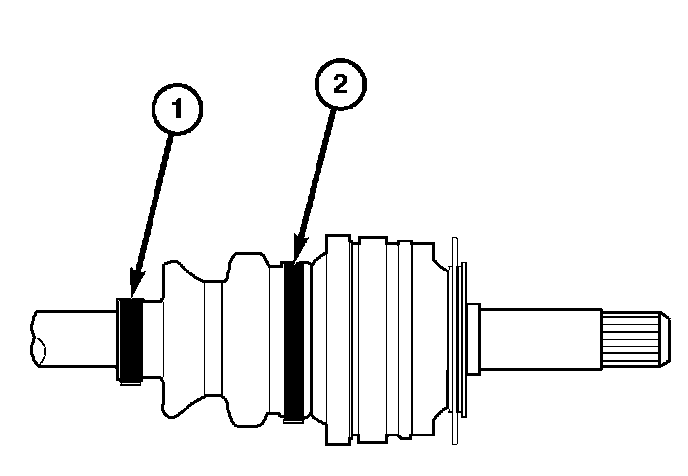 11. Position the inner C/V boot retaining clamp (1) and the outer C/V boot retaining clamp (2) into the sealing grooves on the C/V boot.